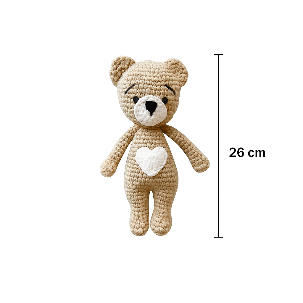 Handcrafted crocheted teddy bear, 26 cm tall, made with soft yarn and featuring an adorable heart detail—perfect for gifts, decor, or cuddles